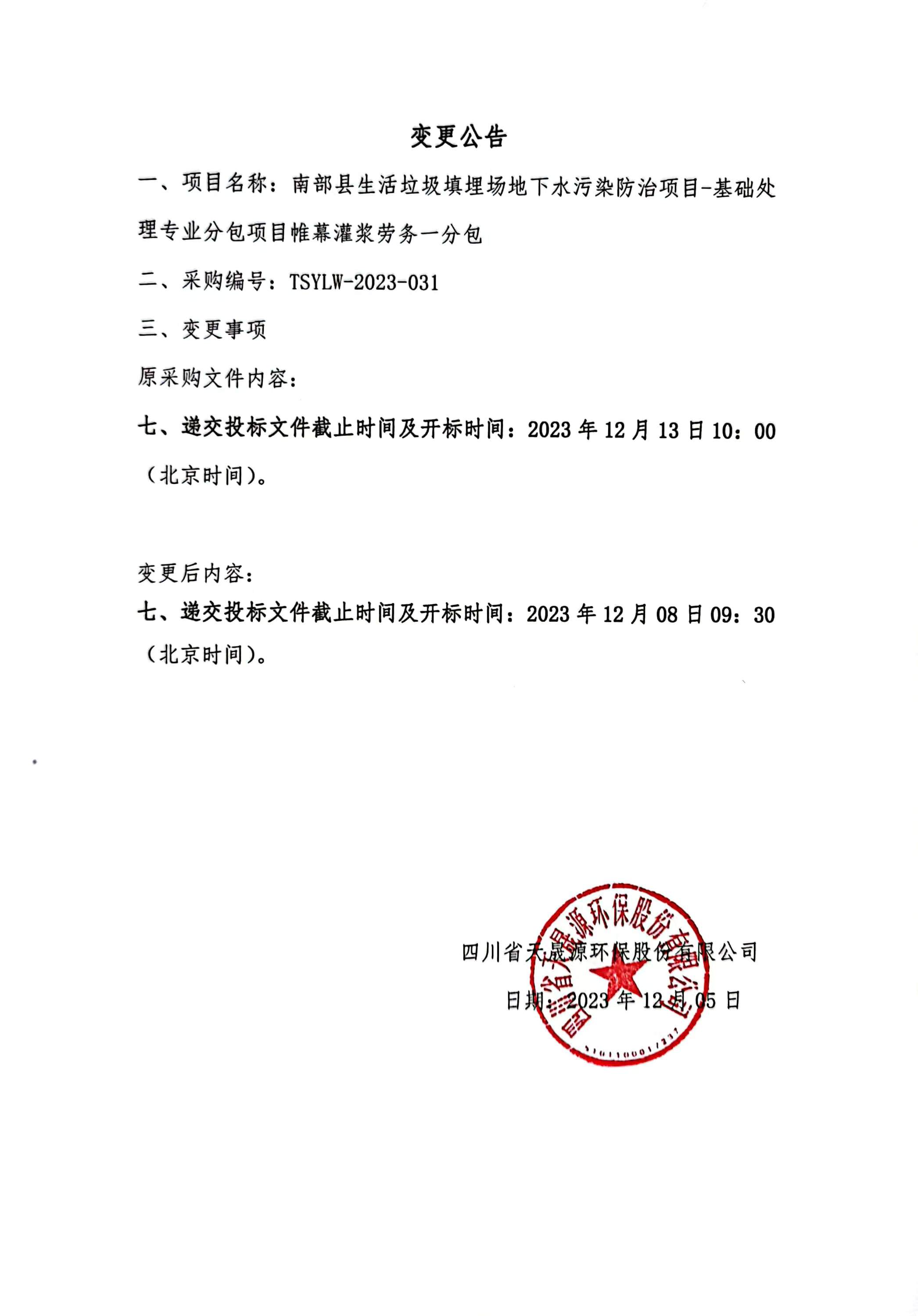 南部县生活垃圾填埋场地下水污染防治项目-基础处理专业分包项目帷幕灌浆劳务一分包(采购编号:TSYLW-2023-031)-变更公告