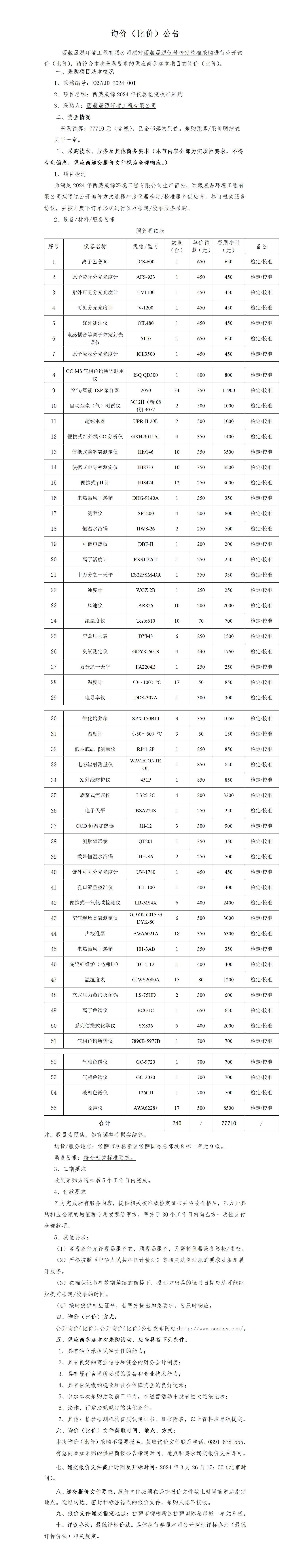 西藏晟源2024年仪器检定校准采购-询价公告