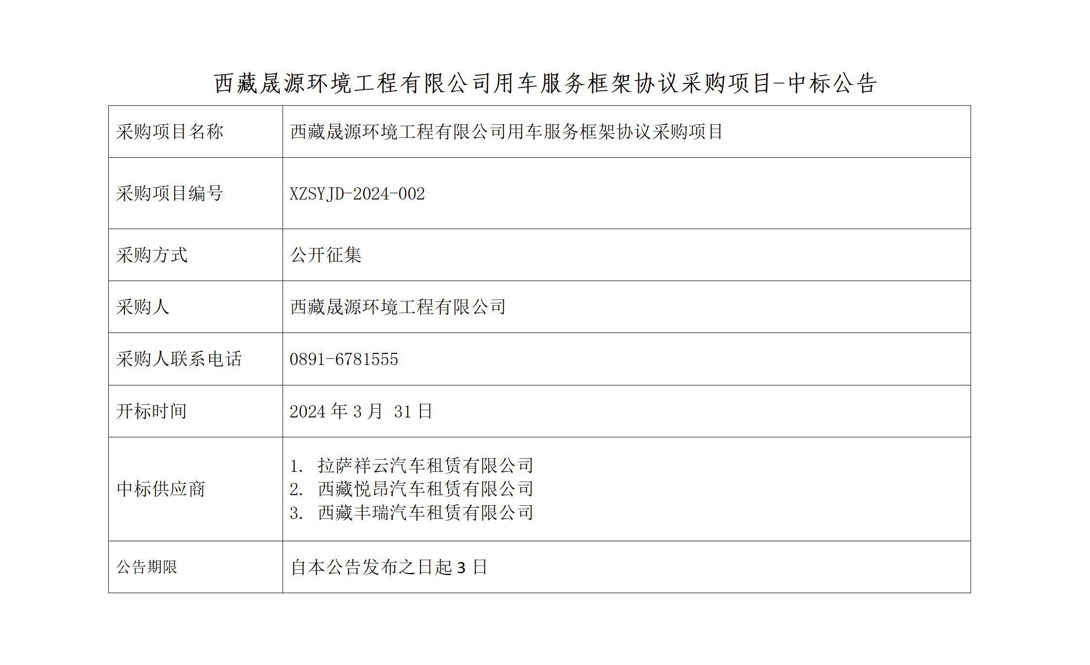 西藏晟源环境工程有限公司用车服务框架协议采购项目-中标公告