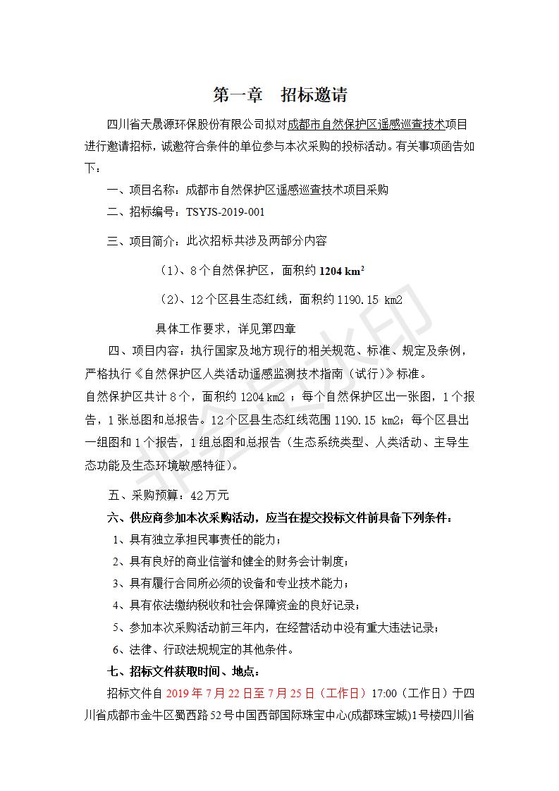 成都市自然保护区遥感巡查技术项目采购(招标标号:TSYJS-2019-001)招标文件