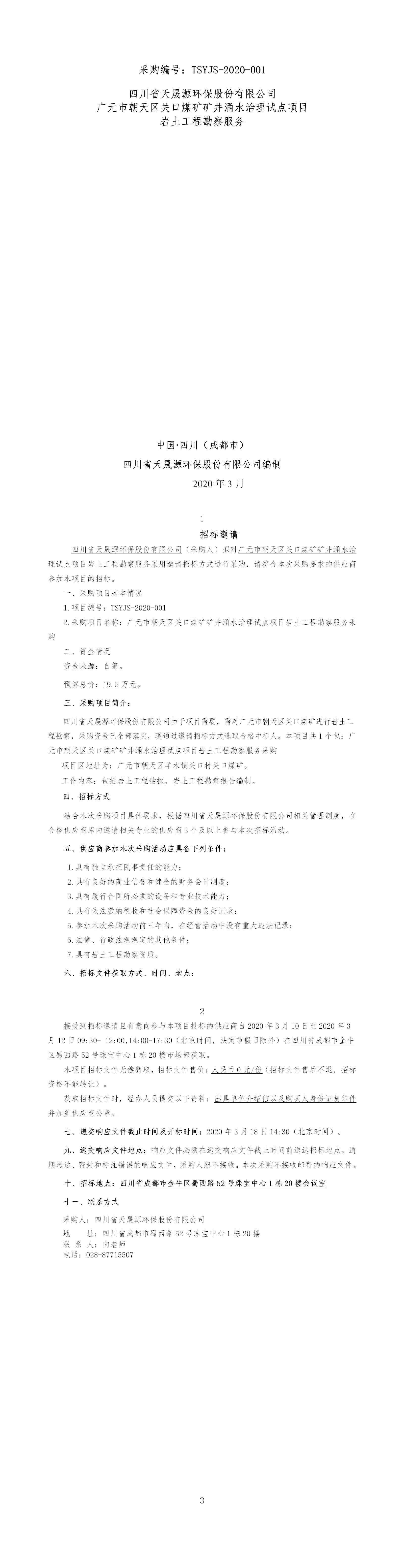 采购编号:TSYJS-2020-001 开云电子官方网站 广元市朝天区关口煤矿矿井涌水治理试点项目 岩土工程勘察服务