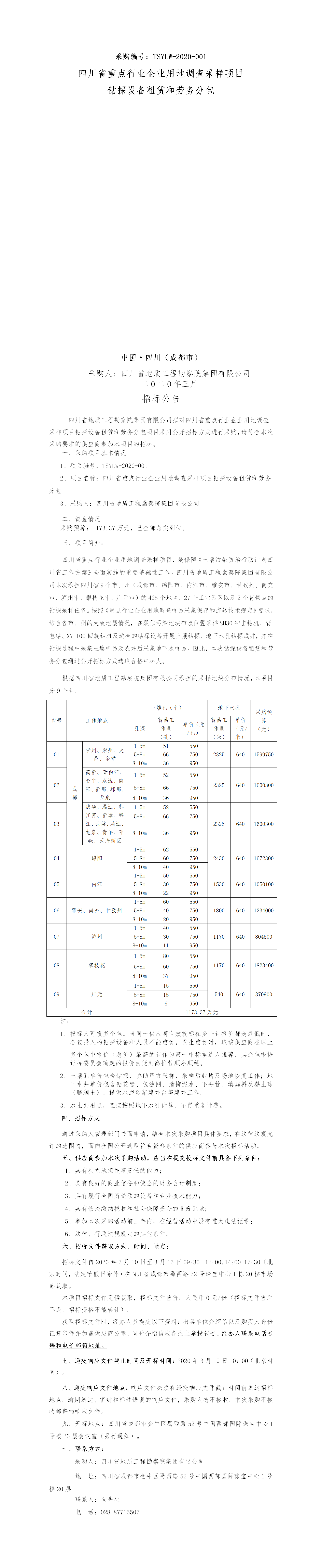 采购编号:TSYLW-2020-001 四川省重点行业企业用地调查采样项目 钻探设备租赁和劳务分包