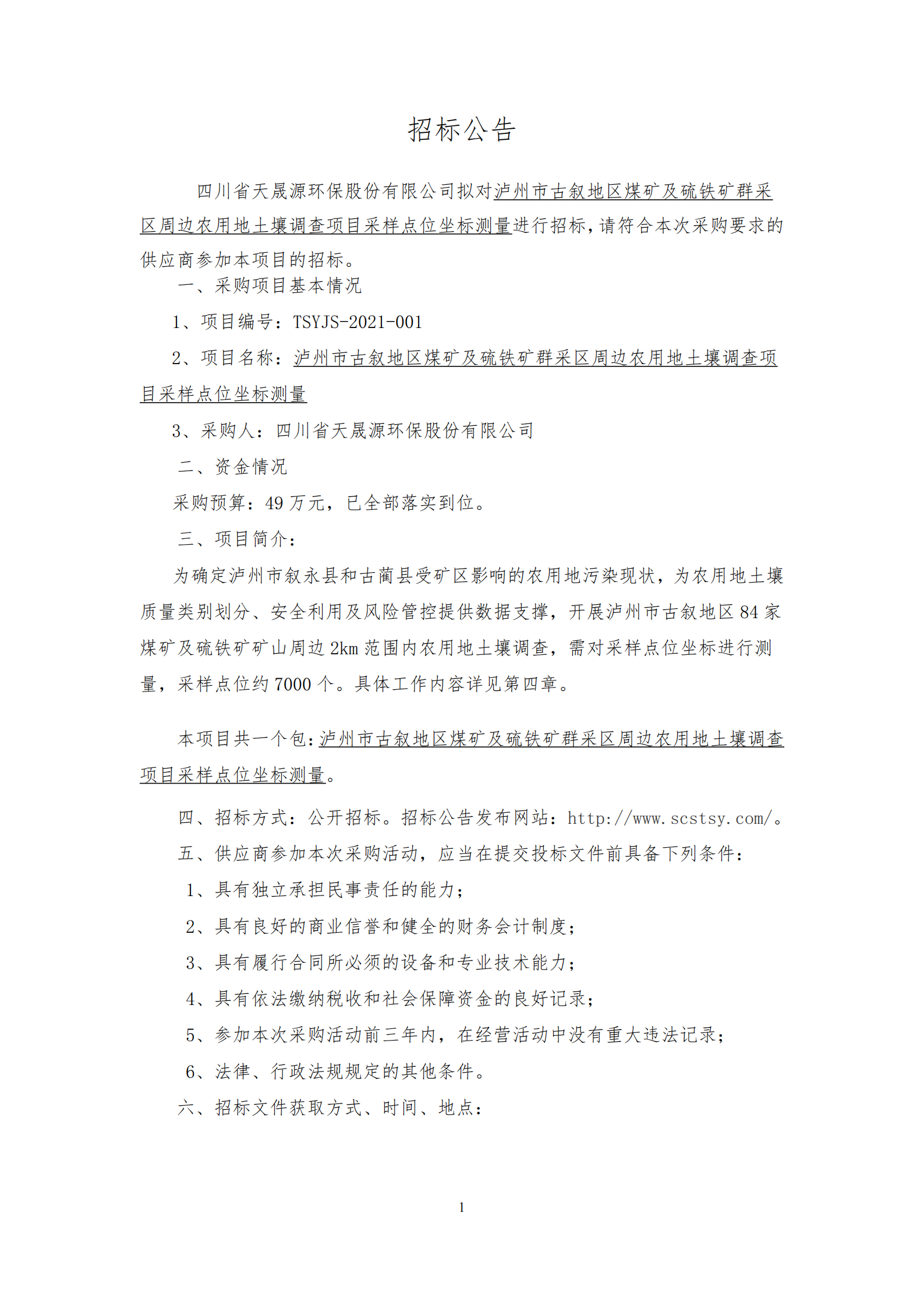 TSYJS-2021-001泸州市古叙地区煤矿及硫铁矿群采区周边农用地土壤调查项目采样点位坐标测量-招标公告