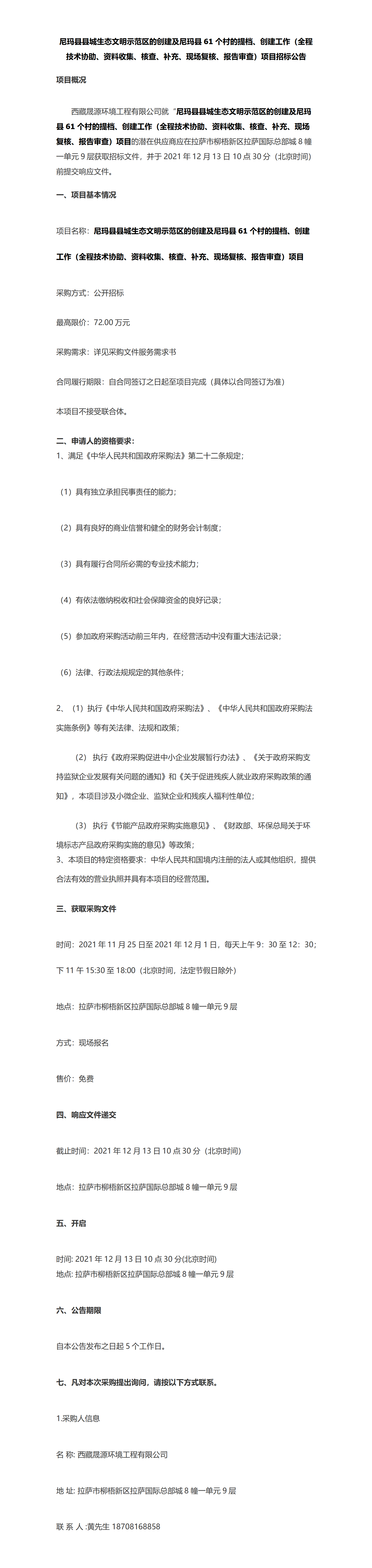 尼玛县县城生态文明示范区的创建及尼玛县61个村的提档、创建工作(全程技术协助、资料收集、核查、补充、现场复核、报告审查)项目招标公告