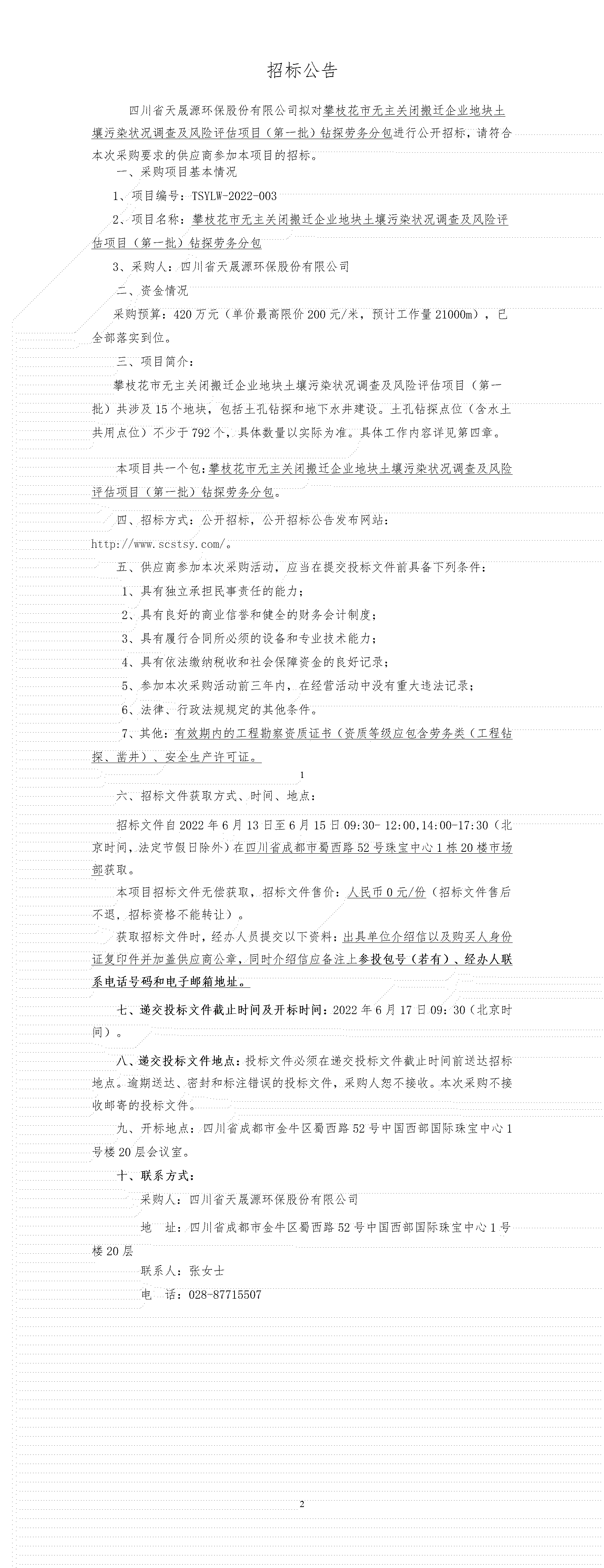 TSYLW-2022-003 攀枝花市无主关闭搬迁企业地块土壤污染状况调查及风险评估项目(第一批)钻探劳务分包-招标公告