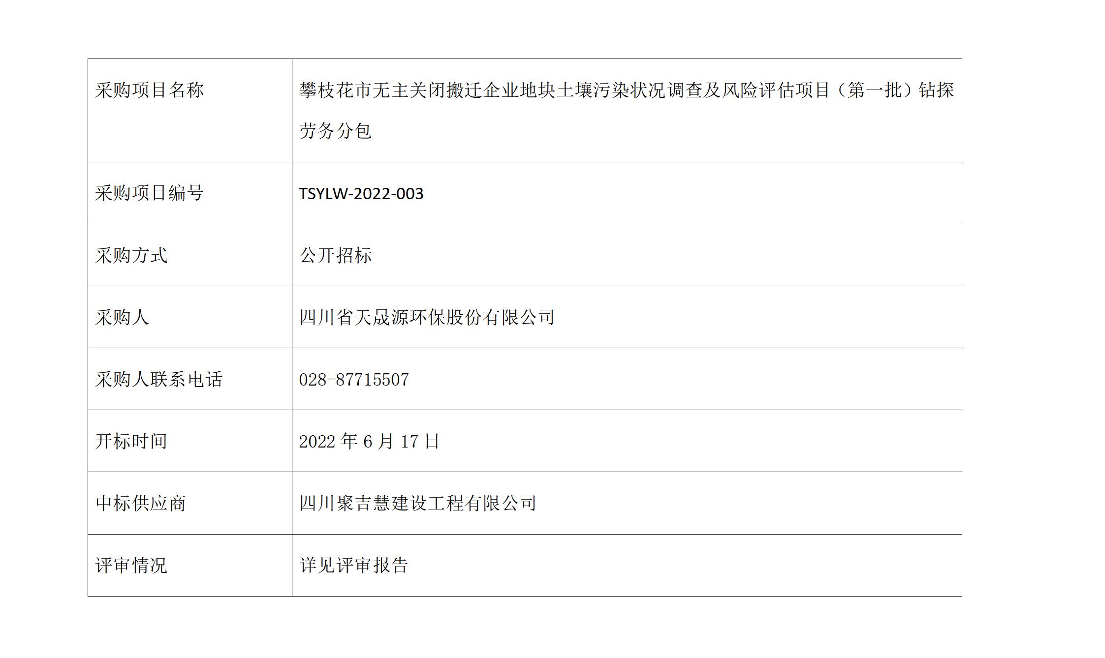 招标结果公示表-攀枝花市无主关闭搬迁企业地块土壤污染状况调查及风险评估项目(第一批)钻探劳务分包TSYLW-2022-003