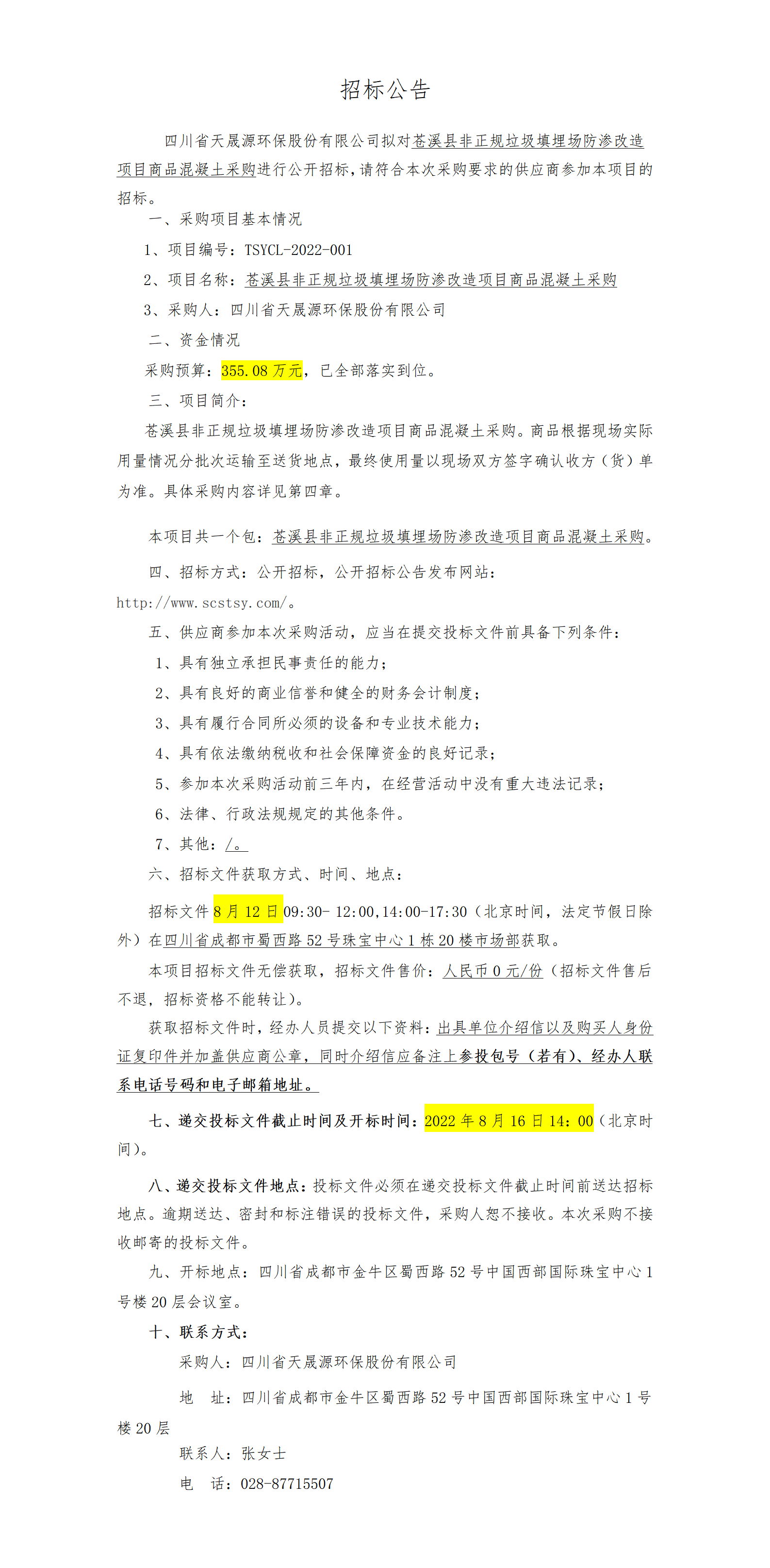 招标公告-TSYCL-2022-001苍溪县非正规垃圾填埋场防渗改造项目商品混凝土采购