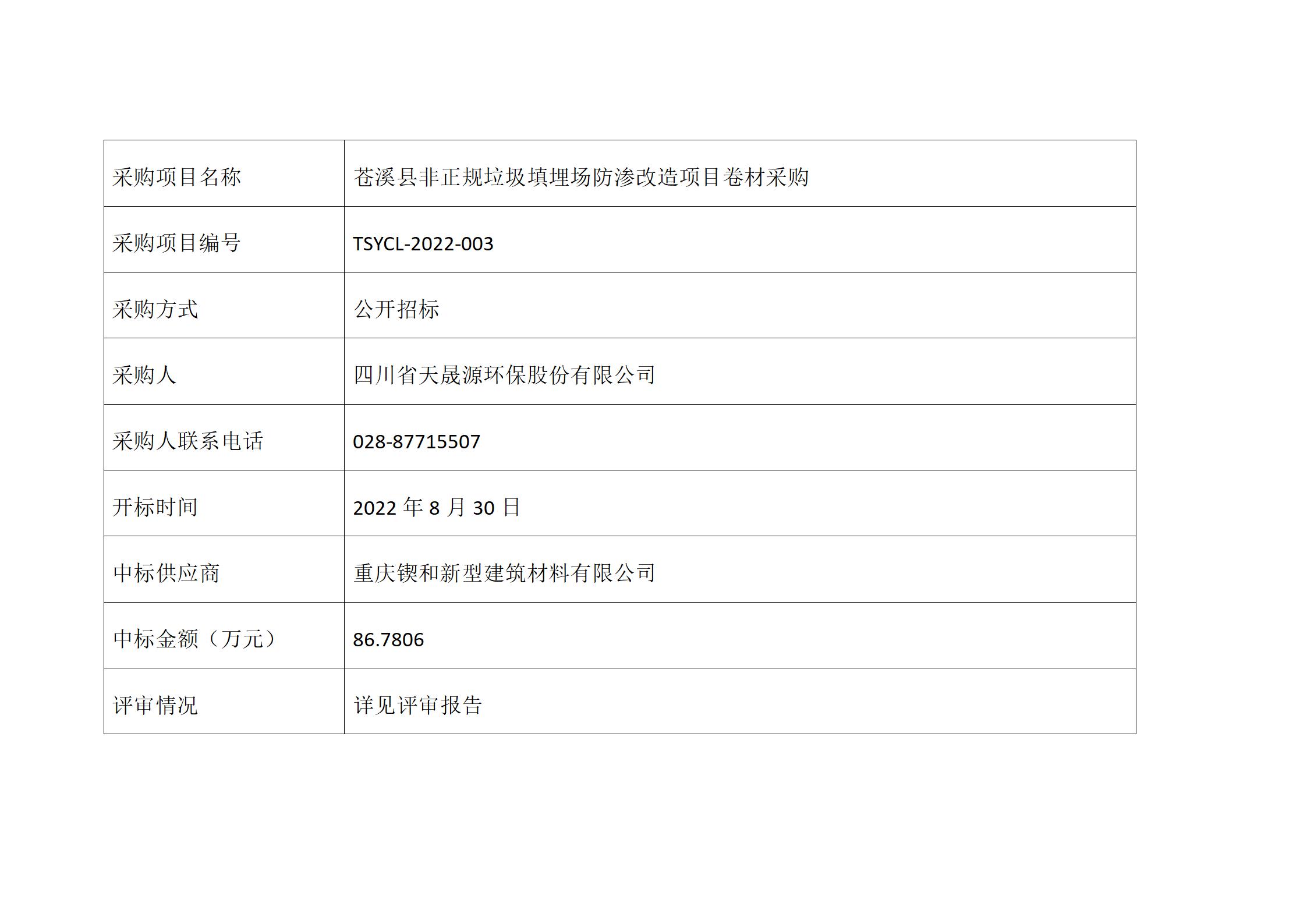 中标公告-苍溪县非正规垃圾填埋场防渗改造项目卷材采购TSYCL-2022-003