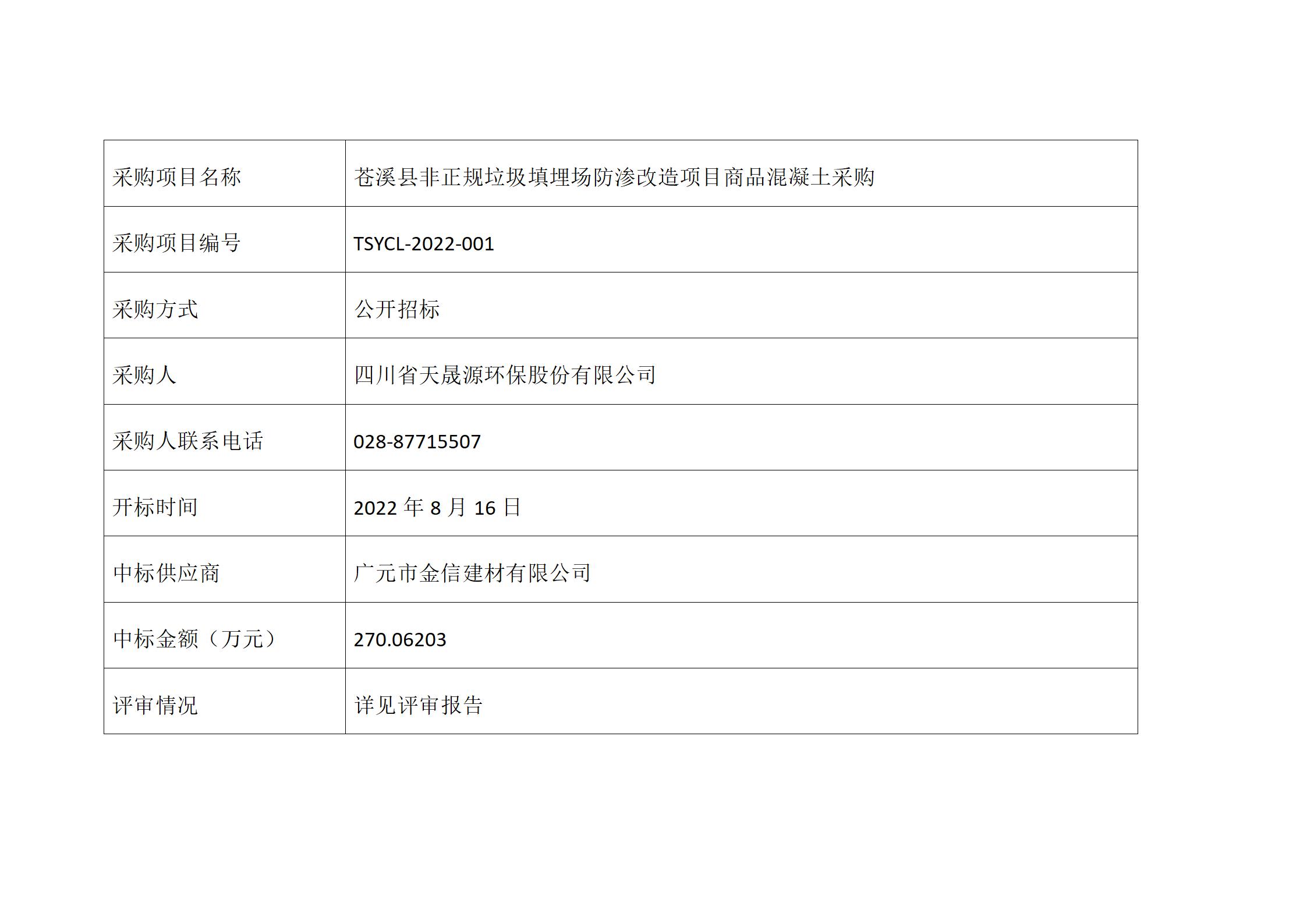中标公告-苍溪县非正规垃圾填埋场防渗改造项目商品混凝土采购TSYCL-2022-001