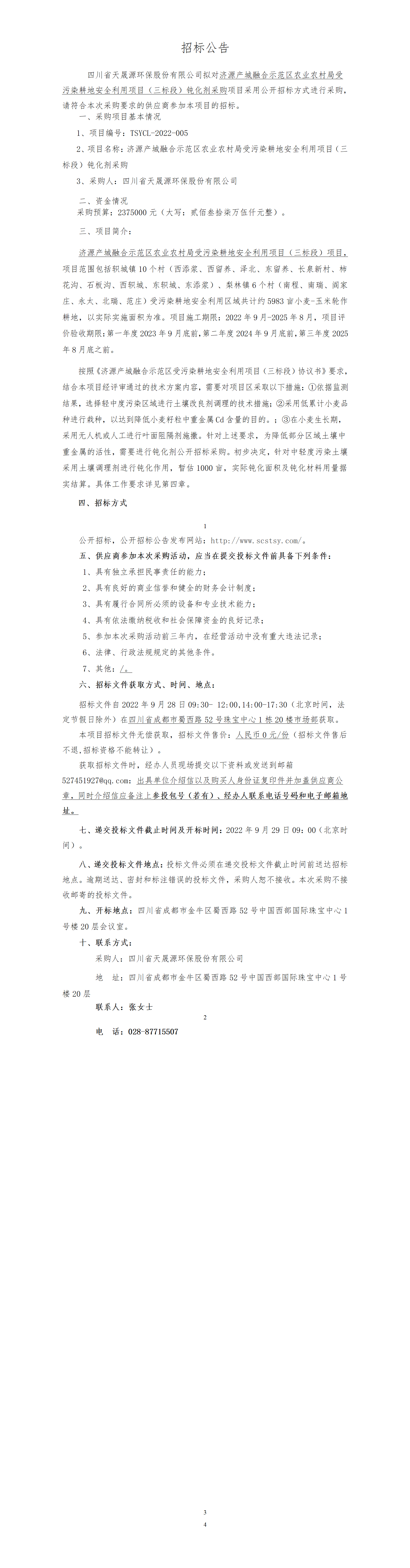 TSYCL-2022-005 济源产城融合示范区农业农村局受污染耕地安全利用项目(三标段)-钝化剂采购公开招标-招标公告