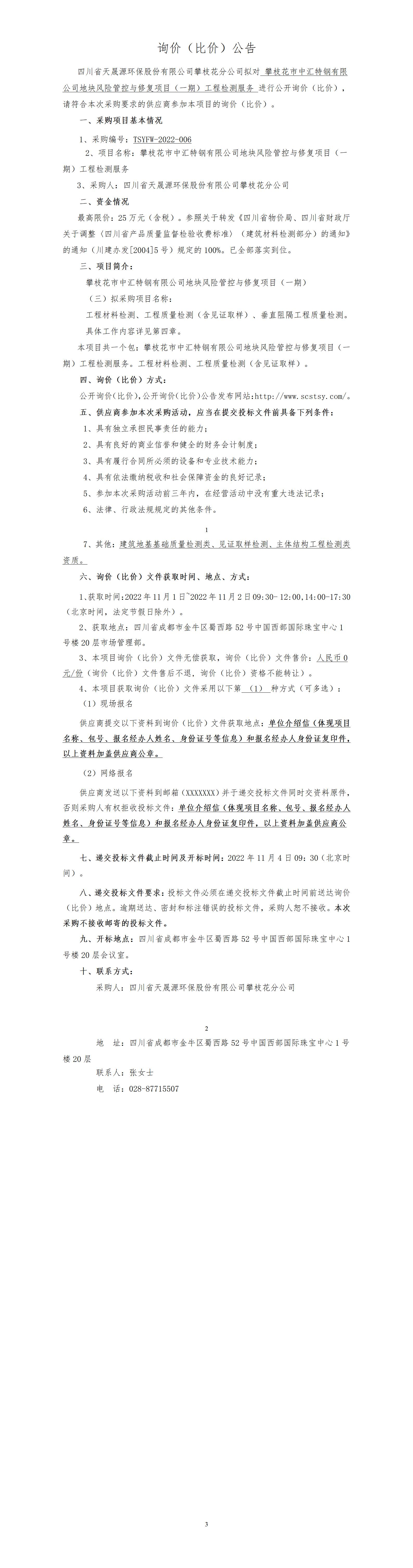 TSYFW-2022-006攀枝花市中汇特钢有限公司地块风险管控与修复项目(一期)工程检测公开询价(比价)公告