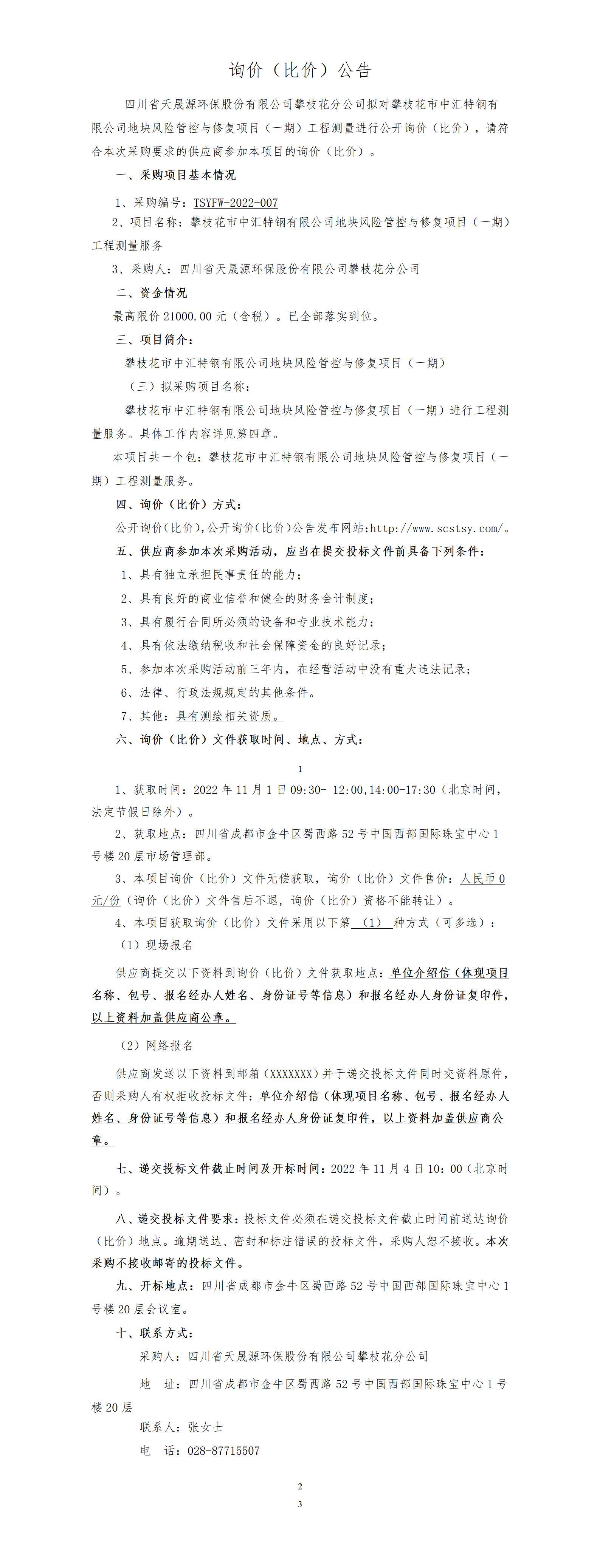 TSYFW-2022-007攀枝花市中汇特钢有限公司地块风险管控与修复项目(一期)工程测量公开询价(比价)公告