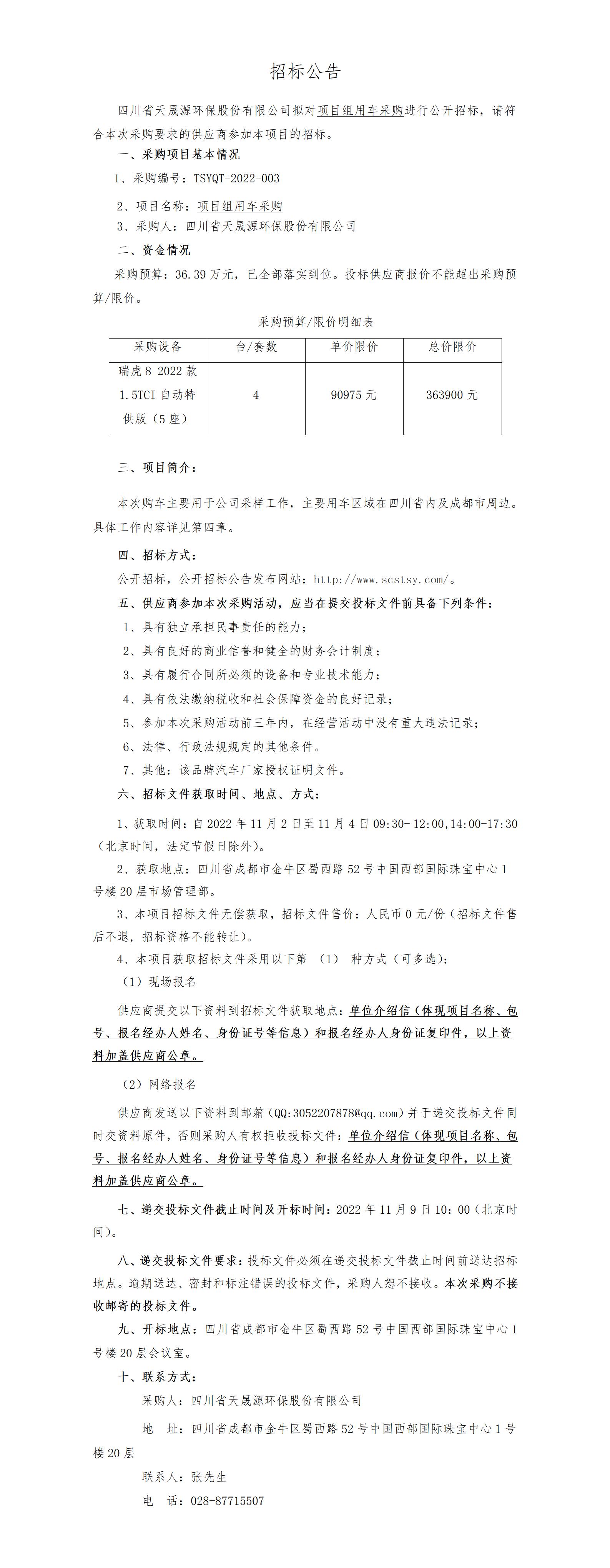 招标公告-项目组用车采购-TSYQT-2022-003