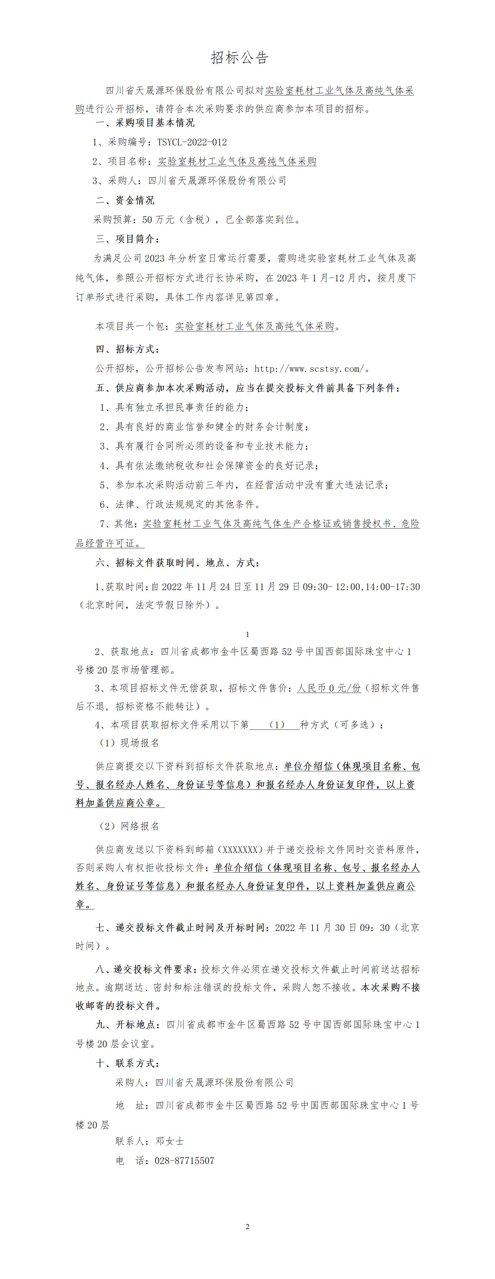 实验室2023年耗材工业气体及高纯气体采购-招标公告