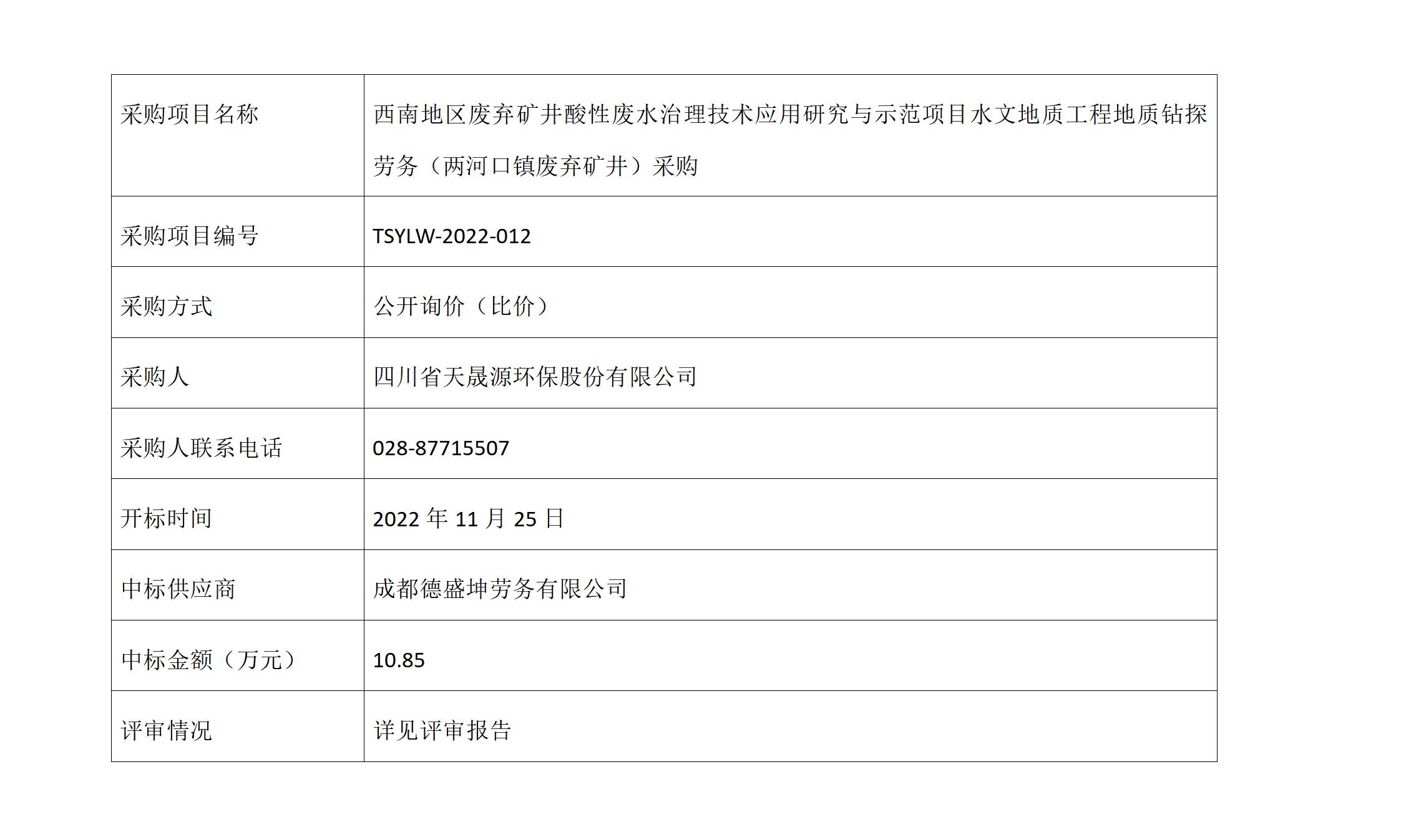 中选公告-西南地区废弃矿井酸性废水治理技术应用研究与示范项目水文地质工程地质钻探劳务(两河口镇废弃矿井)采购西南地区废弃矿井酸性废水治理技术应用研究与示范项目水文地质工程地质钻探劳务(两河口镇废弃矿井)采购