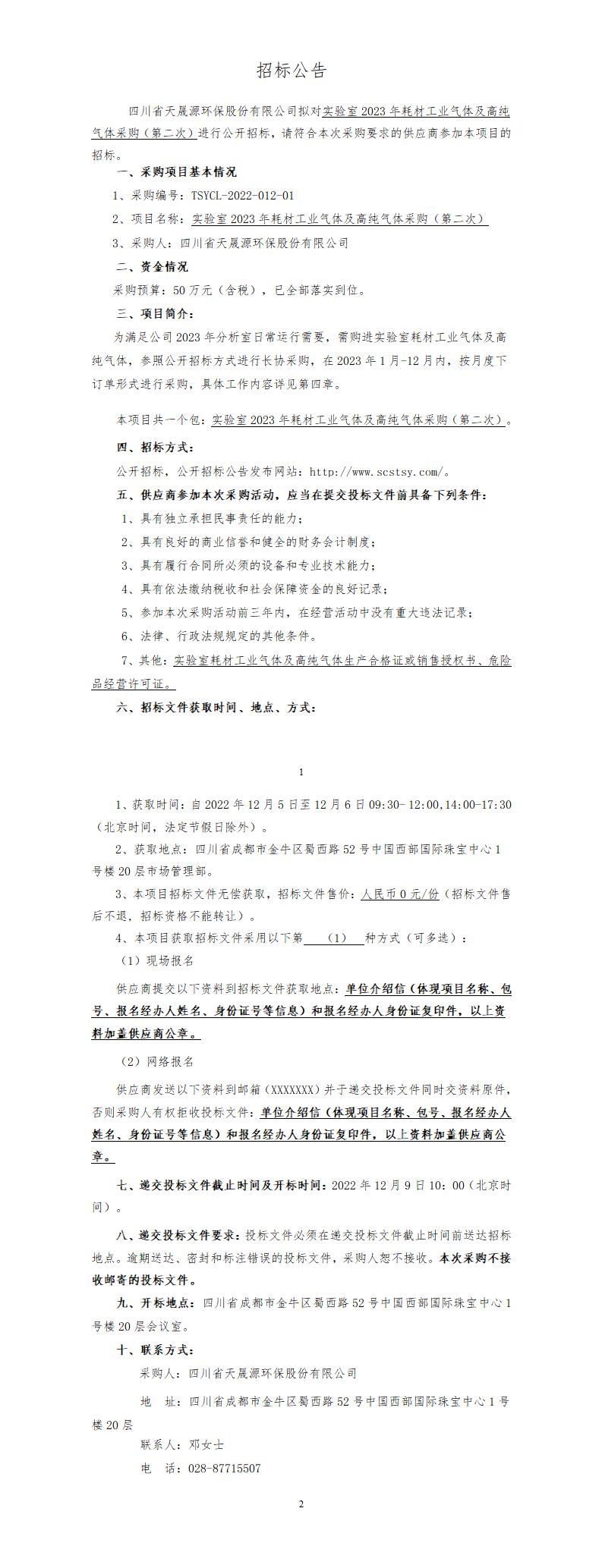 实验室2023年耗材工业气体及高纯气体采购(第二次)-招标公告