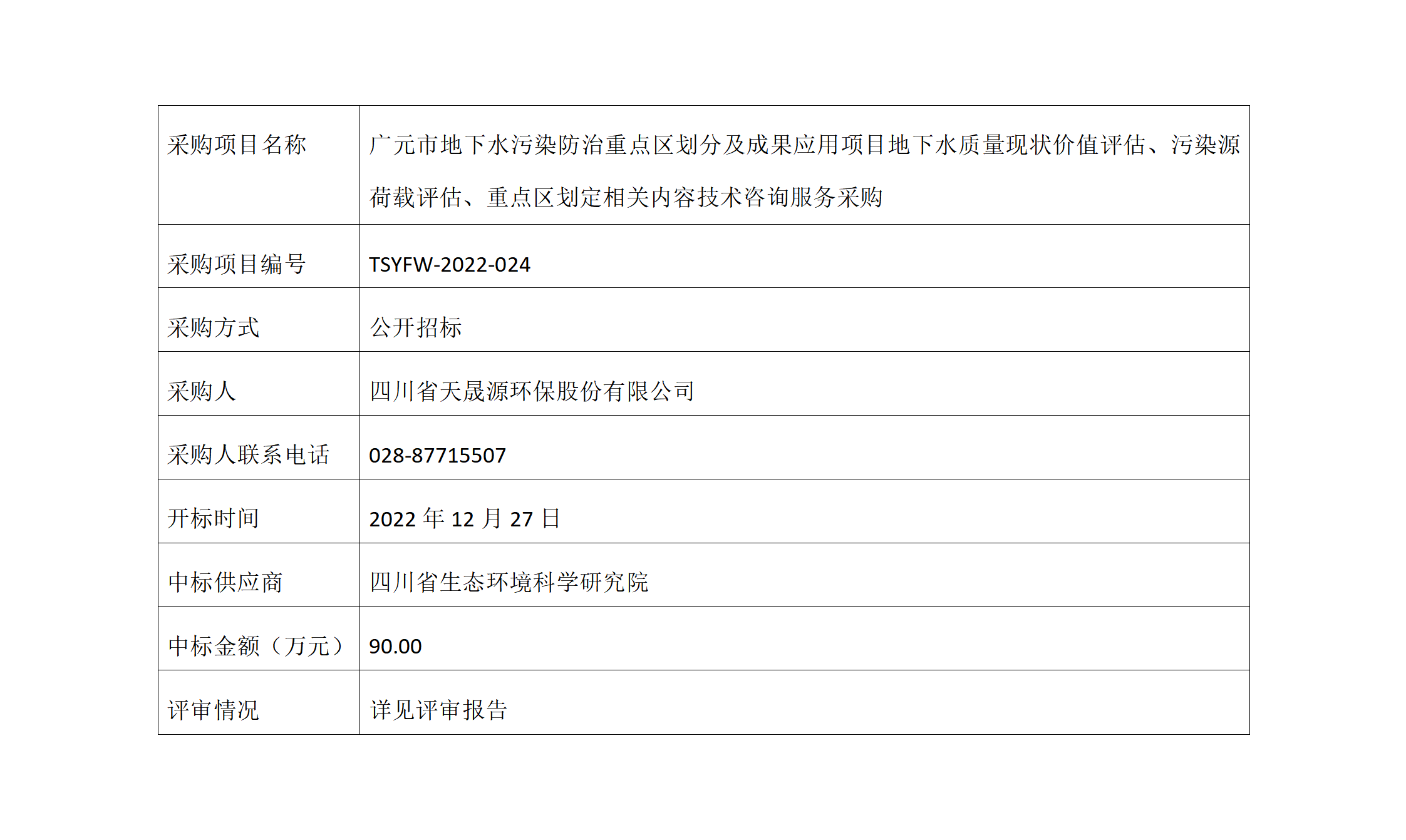 中标公告-广元市地下水污染防治重点区划分及成果应用项目地下水质量现状价值评估、污染源荷载评估、重点区划定相关内容技术咨询服务采购