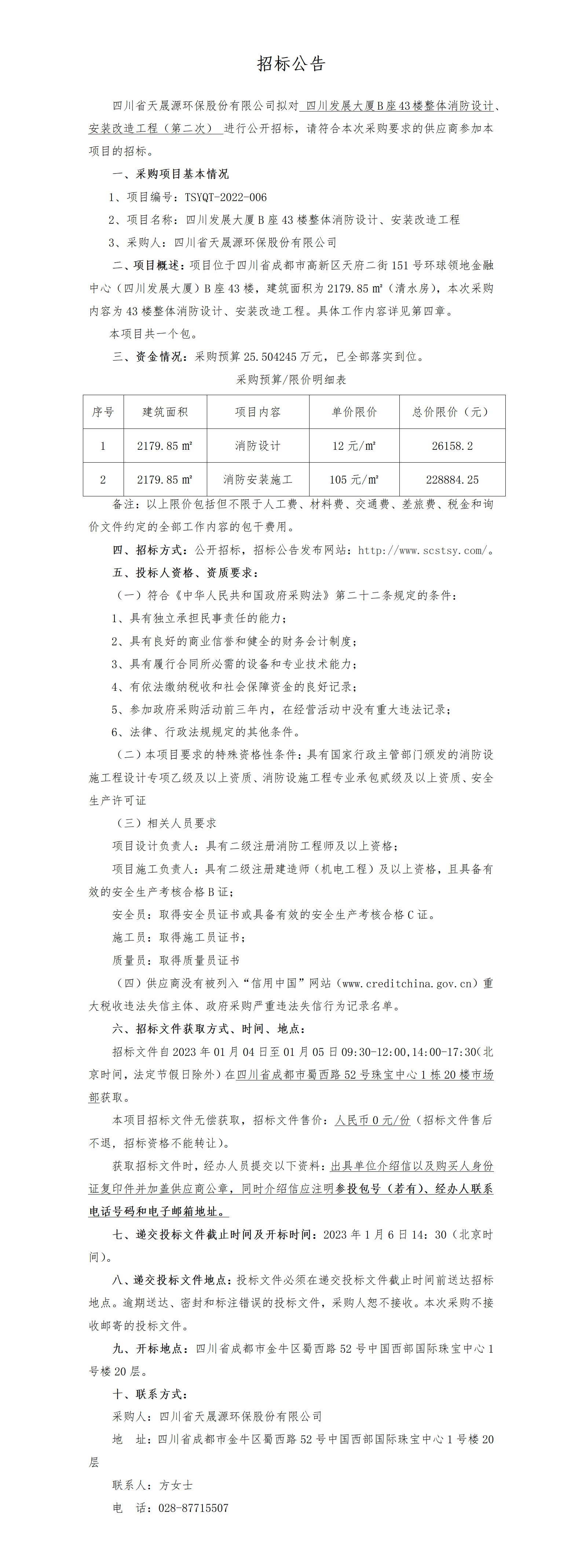 四川发展大厦B座43楼整体消防设计、安装改造工程采购(第二次)-招标公告