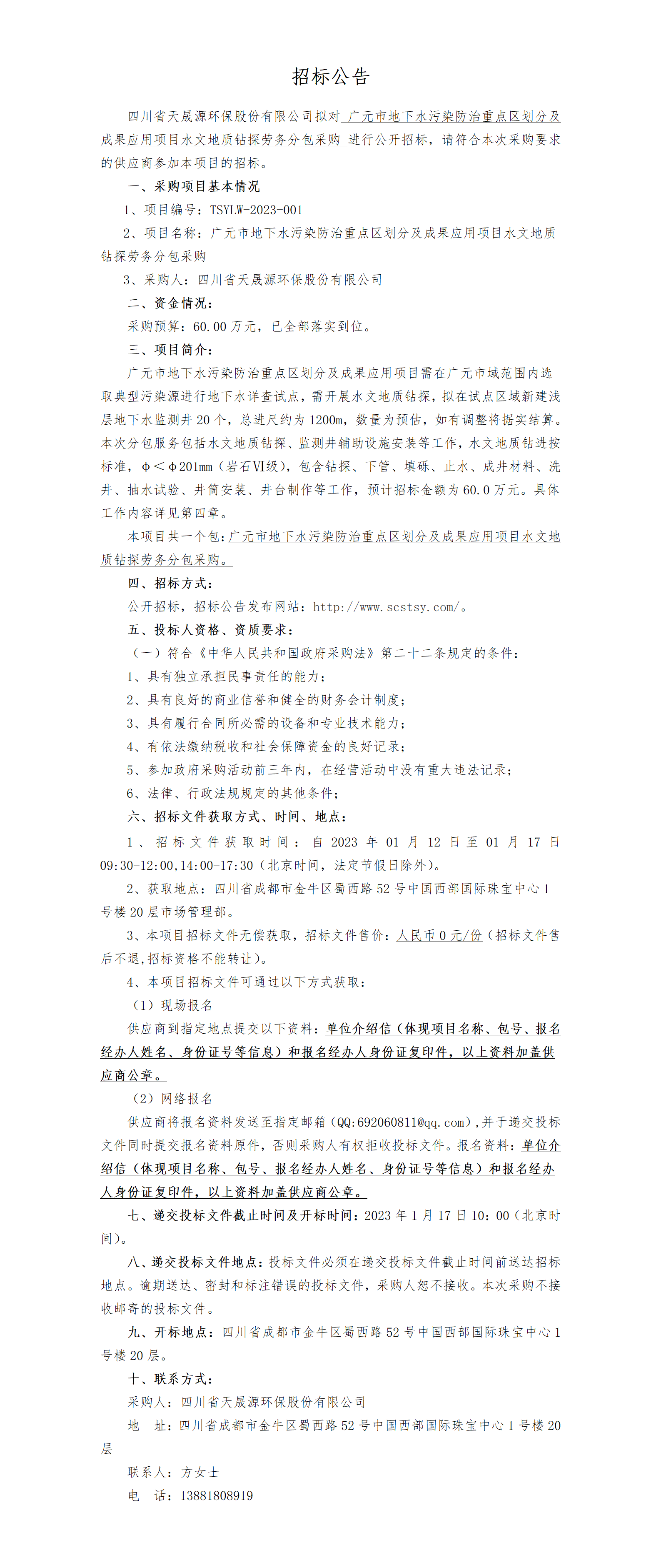 广元市地下水污染防治重点区划分及成果应用项目水文地质钻探劳务分包采购-招标公告
