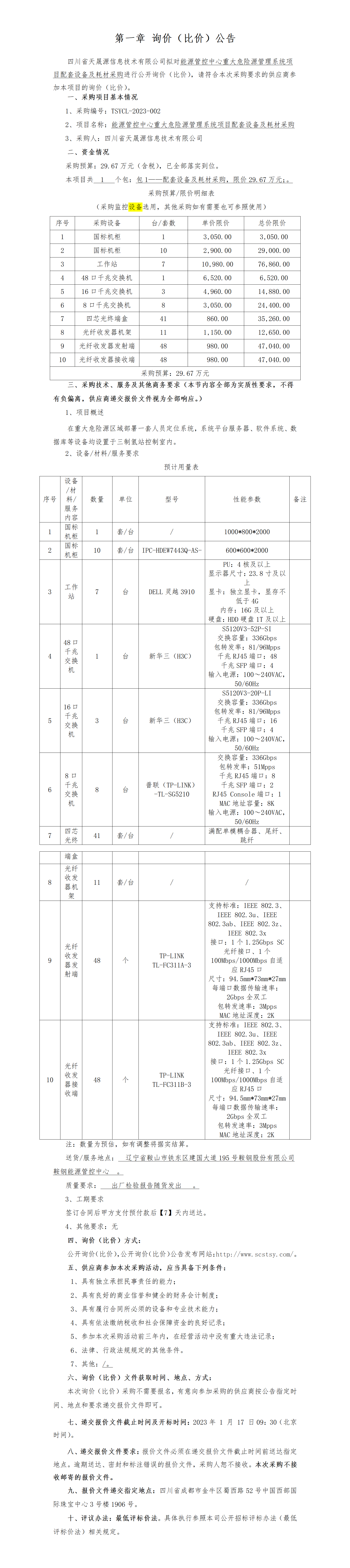 能源管控中心重大危险源管理系统项目配套设备及耗材采购-公开询价比价公告