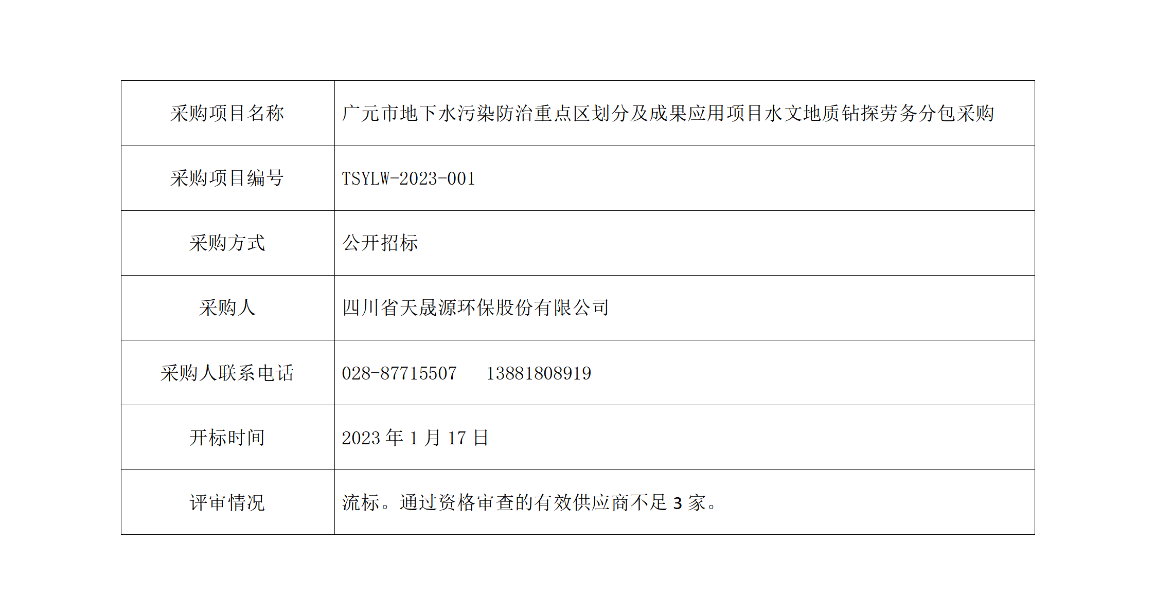 流标公告-广元市地下水污染防治重点区划分及成果应用项目水文地质钻探劳务分包采购