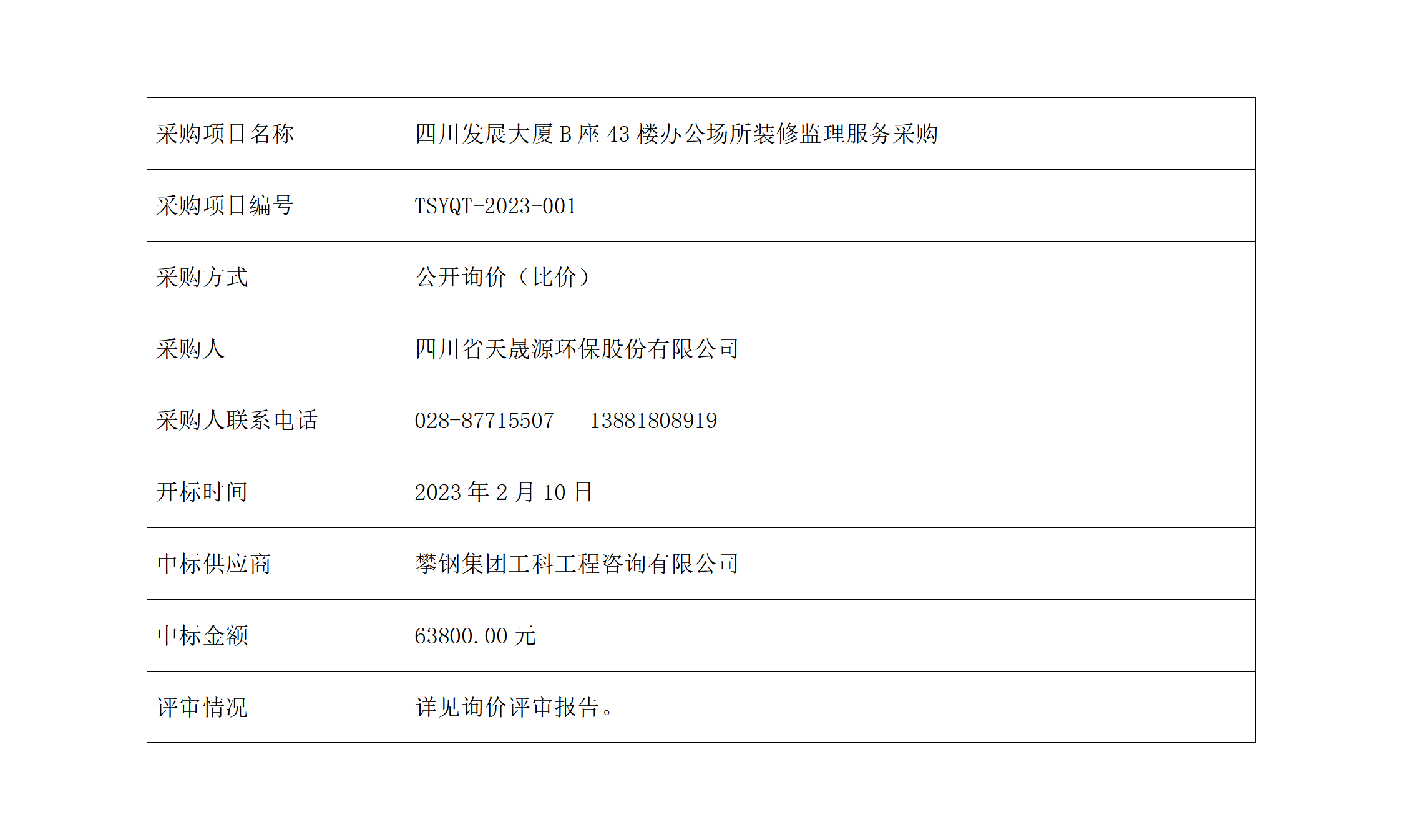 中选公告-四川发展大厦B座43楼办公场所装修监理服务采购