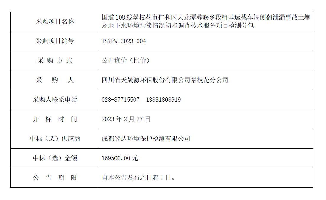 中选公告-国道108线攀枝花市仁和区大龙潭彝族乡段粗苯运载车辆侧翻泄漏事故土壤及地下水环境污染情况初步调查技术服务项目检测分包