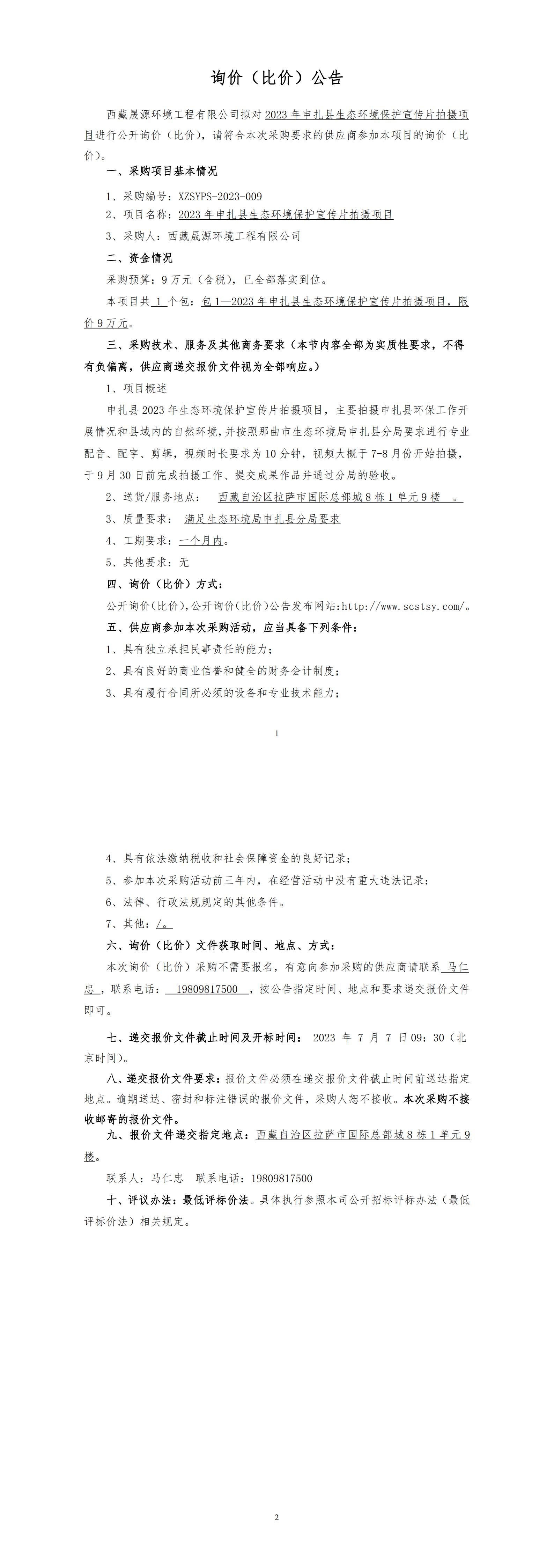 询价(比价)公告-2023年申扎县生态环境保护宣传片拍摄项目