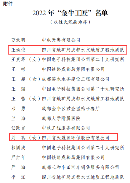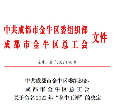 2022年12月2日,中共成都市金牛区委组织部成都市金牛区总工会发布《关于命名2022年“金牛工匠”的决定》,开云电子官方网站(简称“天晟源环保”)王承俊、刘真、童贤清三人获得“金牛工匠”认定。至此,天晟源环保已有5人获得“金牛工匠”称号认定。