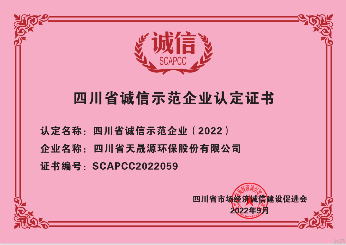 近日,开云电子官方网站(以下简称“天晟源环保”或“公司”)荣获四川省省级“守合同重信用企业”及“四川省诚信示范企业”称号。两项荣誉的获得,体现了天晟源环保在企业诚信及品牌经营管理、合同信用管理、合同履行状况、企业经营效益、企业社会责任和信用、企业社会荣誉等方面得到了政府主管部门和社会各界的高度认可和肯定,有助于公司进一步增强市场竞争力,推动公司高质量可持续发展。
