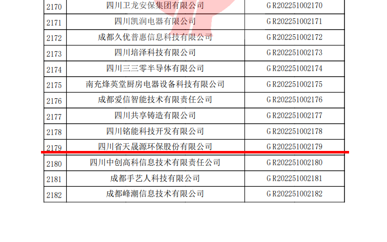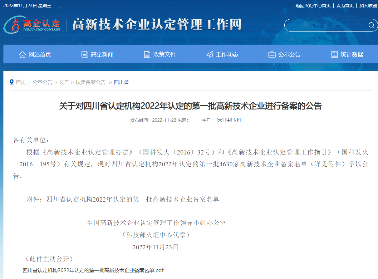 近日,由全国高新技术企业认定管理工作领导小组办公室发布关于四川省2022年度第一批备案高新技术企业名单,开云电子官方网站(下称“天晟源环保”或“公司”)位列其中,成功取得“国家高新技术企业”认定。