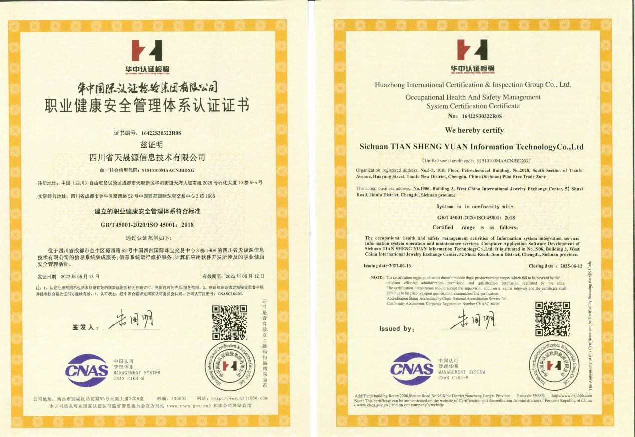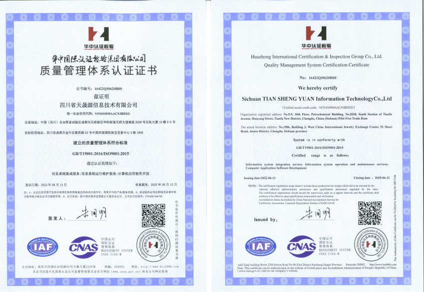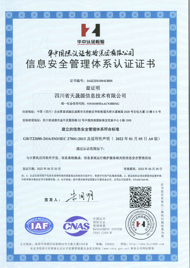 2022年6月30日,四川省天晟源信息技术有限公司(简称“信息子公司”)顺利通过了信息安全管理体系认证的专项审核,正式获得质量管理体系(GB/T19001-2016/ISO 9001:2015)、环境管理体系(GB/T24001-2016/ISO 14001:2015)、职业健康安全管理体系(GB/T45001-2020/ISO 45001:2018)和信息安全管理体系(GB/T22080-2016/ISO/IEC 27001:2013)四项认证证书,这标志信息子公司在信息系统集成、信息系统运行维护和计算机应用软件开发方面的规范化、标准化和信息安全管理水平达到新的高度。
