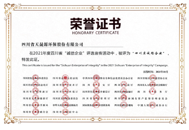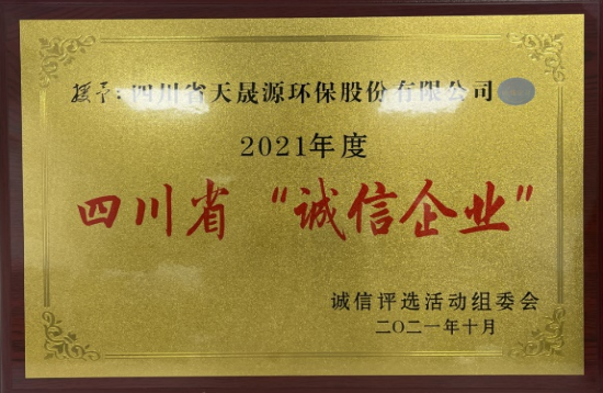 在以公司总经理张恒同志为首的公司经营管理团队带领下,天晟源环保自成立以来,坚持以人为本,着力构建和谐劳动关系,公司经济效益和社会效益得到了全面发展,公司先后获得成都市“守合同重信用”企业称号、中国环境保护产业协会企业信用评价AAA等级、国家税务总局四川省电子税务局纳税信用状态评价A级等众多诚信荣誉,具有极高的社会信誉认可度及行业诚信赞誉度。