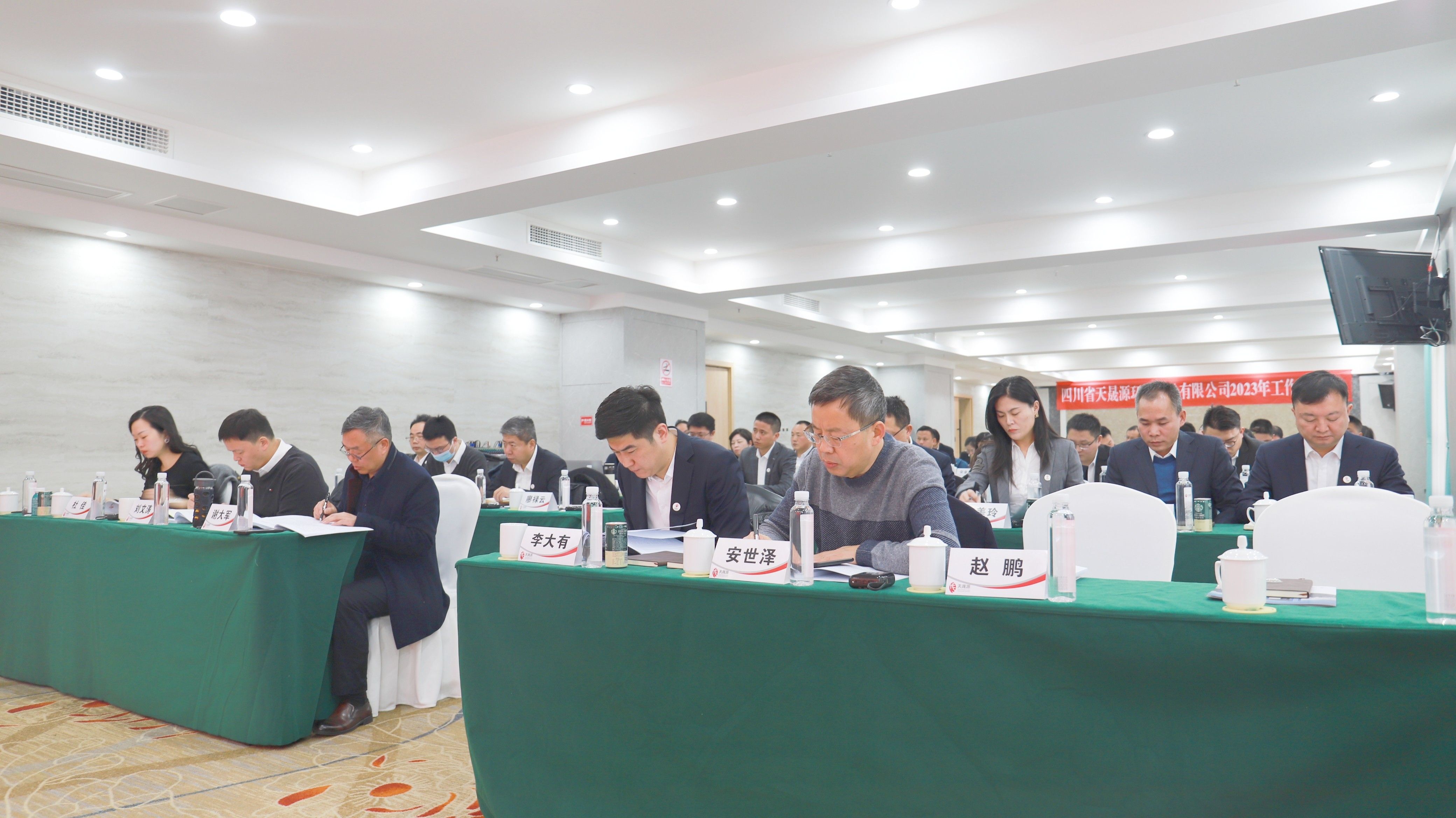 四川清新环境科技有限公司总经理,天晟源环保董事赵鹏希望大家加强工作中的目标管理,正确面对改革过程中的阵痛,同时衷心祝愿公司发展蒸蒸日上;原四川省地质工程勘察院集团有限公司董事长、总经理,天晟源环保董事长安世泽莅临会议现场并致辞,他鼓励天晟源环保保持现有发展势头,在双方股东带领下继续优化企业战略、拓展专业领域、深挖存量市场、延伸产业链条、加强技术支撑;天晟源环保董事长李大有代表公司感谢双方股东一年来的信任与支持,帮助公司走过了真的不一般、真的不容易的一年。他表示,公司将在2024年坚定理想信念,怀揣发展的恒心、开拓的信心、改革的决心、通达的耐心,以资本、实业、技术这“三驾马车”带动公司向上市目标全速前进。