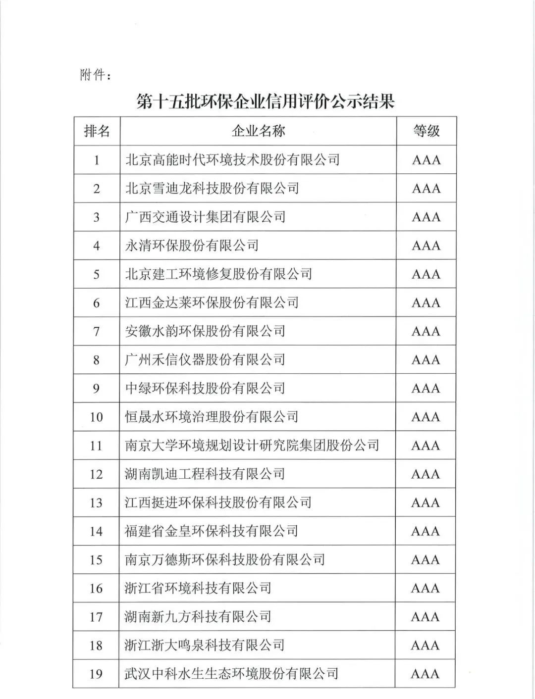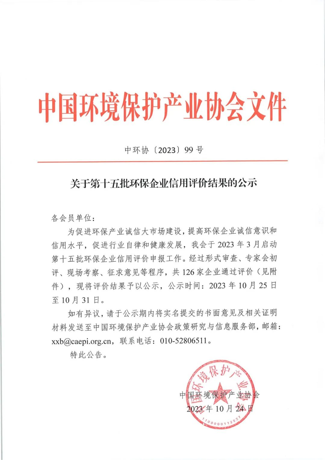 10月31日,在2023年中环协第十五轮环保企业信用评价中,开云电子官方网站(简称:“天晟源环保”)再次荣获中国环保产业协会授予的“AAA级环保企业信用评价”荣誉。这是天晟源环保继2020年首次获得该项荣誉并期满后,再次以优秀的表现和扎实的环保业绩获得此项顶级评价。