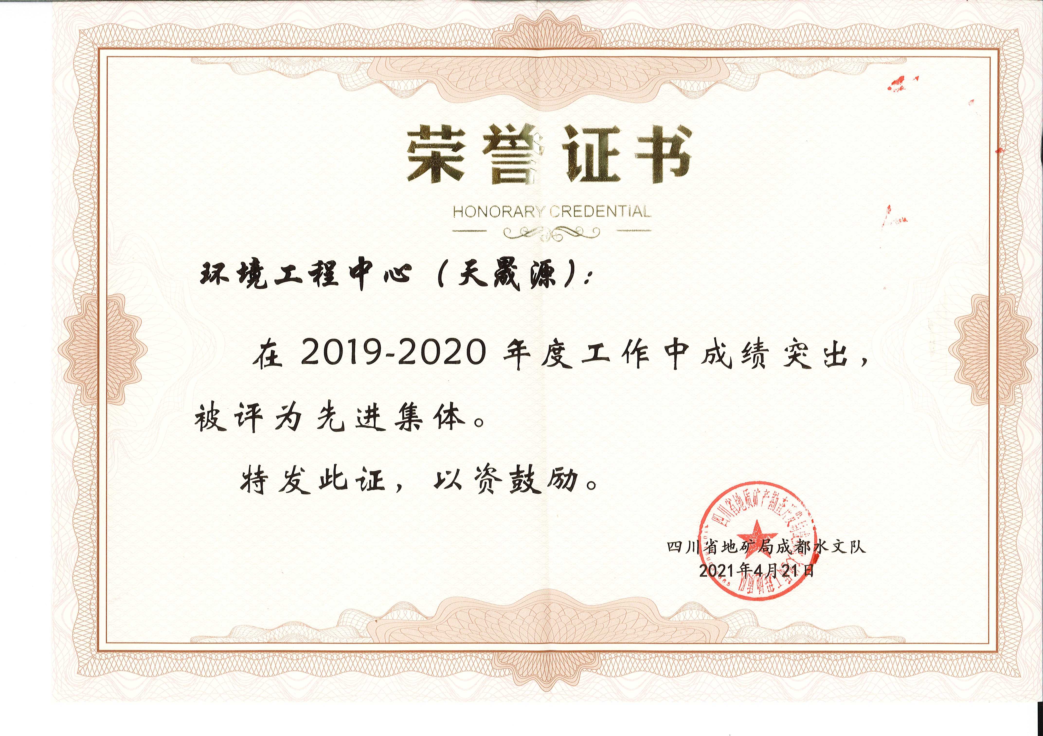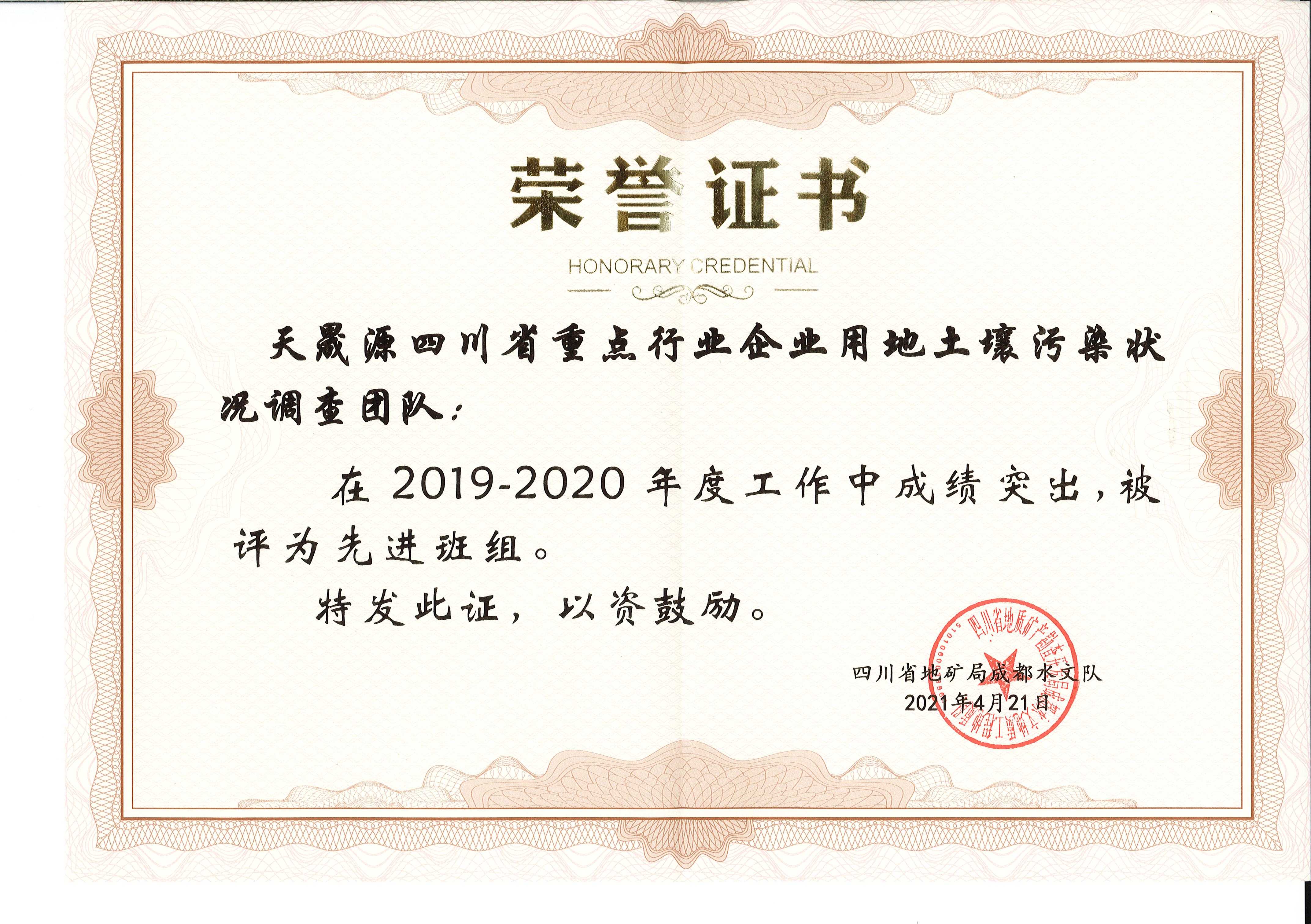 2021年4月25日,四川省地矿局成都水文队印发了《关于表彰2019~2020年度先进集体(班组)和先进生产(工作)者暨最美川勘人的决定》(川地矿成水发〔2021〕16号),文件对成都水文队2019-2020年度涌现出的先进集体(班组)和个人进行了表彰,四川省地质工程勘察院环境工程中心(天晟源)喜获“先进集体”荣誉,天晟源环保四川省重点行业企业用地土壤污染状况调查团队斩获了“先进班组”称号!