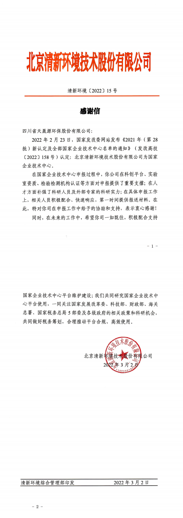在清新环境技术中心申报认定过程中,天晟源环保在科创平台、实验室资质、检验检测机构认证等方面对申报提供了重要支撑;在人才方面补强了科研人员及外部专家的科研实力;在具体申报工作上,相关人员积极配合、快速响应,第一时间提供报送材料。3月2日,清新环境特发来感谢信,向天晟源环保在申报工作中给予的协助和支持表示感谢。