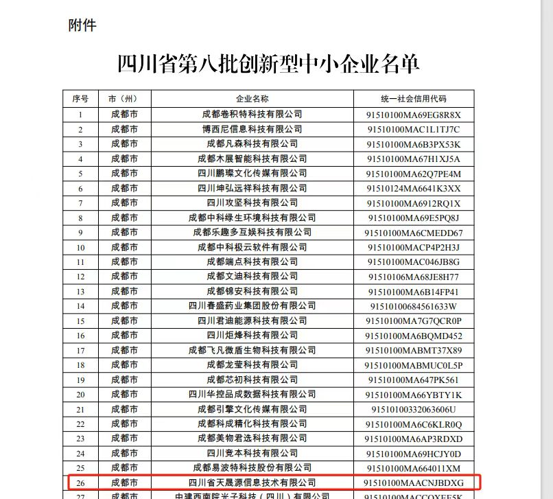 近日,经四川省科学技术厅、四川省经济和信息化厅审核认证,天晟源环保全资子公司四川省天晟源信息技术有限公司(以下简称“天晟源信息”)凭借扎实的核心业务、强劲的创新技术和研发能力成功荣获四川省“科技型中小企业”“创新型中小企业”双重认定。
